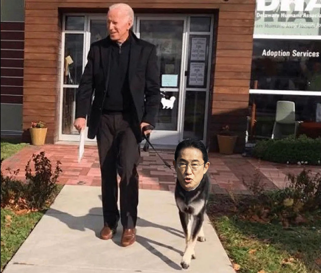 President Biden of the United States has his bitch on a leash. The little bitch keeps his lips puckered so he can kiss Bidens as on demand. That kind of obedience is necessary when you're the PM of a country that got DOMINATED in war and is occupied by 23 conquering forces military bases.